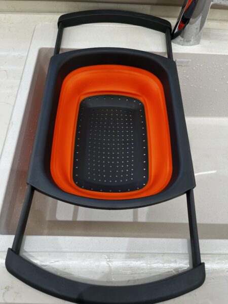 مصفاية مبتكرة بتتركب على المجلى من الجهتين بتتفتح وبتنسحب حسب الحاجة، وبتطلع وبتنزل زي الضغط