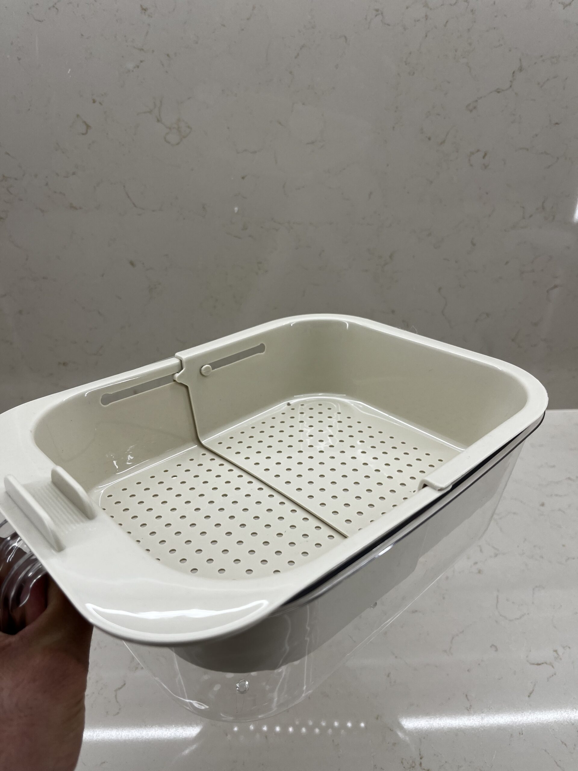 مصفاية مبتكرة بتتركب على المجلى من الجهتين بتتفتح وبتنسحب حسب الحاجة، وبتطلع وبتنزل زي الضغط